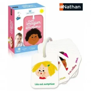 Ce premier Mon Imagier des Emotions 18M+ de Nathan contient 20 cartes présentant chacune l’image d’une émotion de l’enfant. Reliées par un anneau, elles sont faciles et amusantes à manipuler, comme un trousseau de clés. Surprise, tristesse, colère, peur… votre enfant regarde chaque visage et son expression pour apprendre à nommer ses émotions et celles des autres. Une première étape fondamentale pour réguler ses émotions !